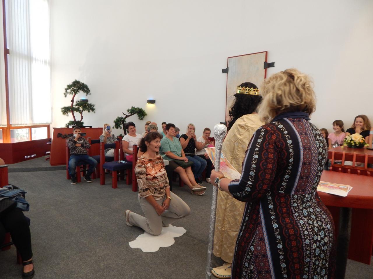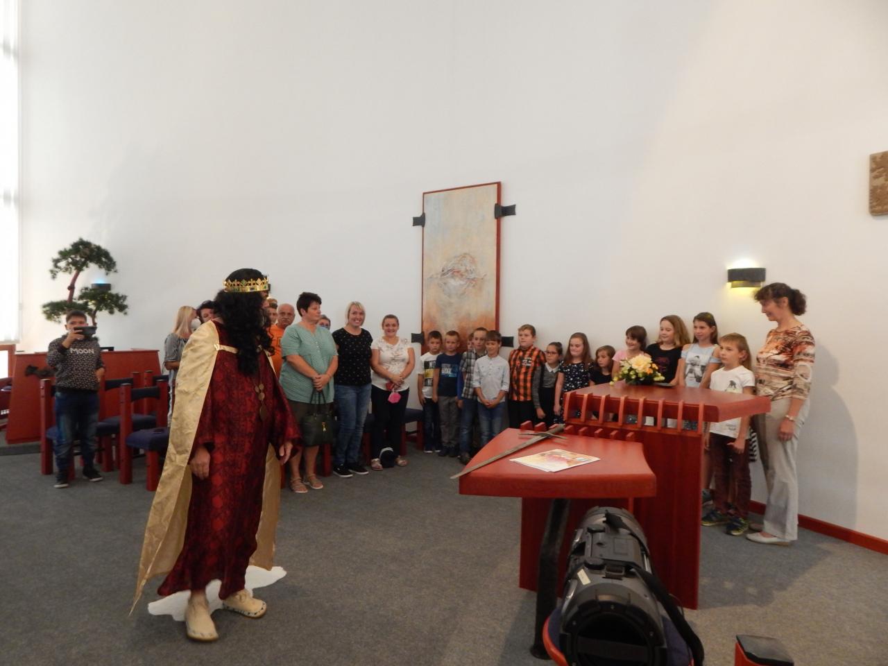 Pasování dětí z třetí třídy ZŠ Třemošnice králem Bibliosem V. do řádu Čtenářského.
