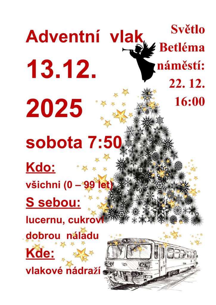V sobotu 13.12. v 7:50 hodin se vypravíme pro Betlémské světlo. S sebou lucernu, cukroví, dobrou náladu. Sraz na vlakovém nádraží v Třemošnici.