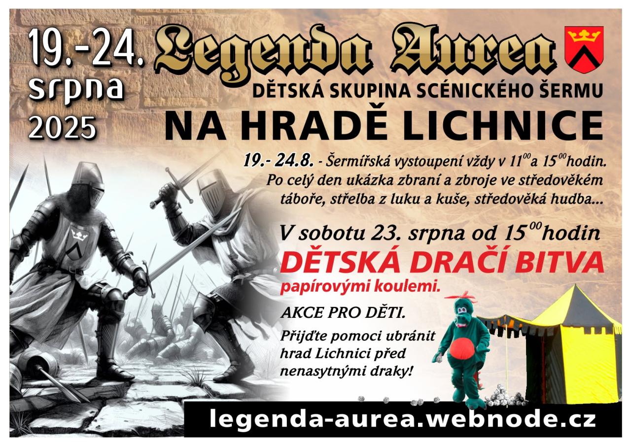 Šermířská vystoupení skupiny Legenda Aurea vždy v 11:00 a 15:00 hodin, po celý den ukázka zbraní a zbroje ve středověkém táboře, střelba z luku a kuše, středověká hudba aj. V sobotu 23.8. akce pro děti - dětská dračí bitva papírovými koulemi.