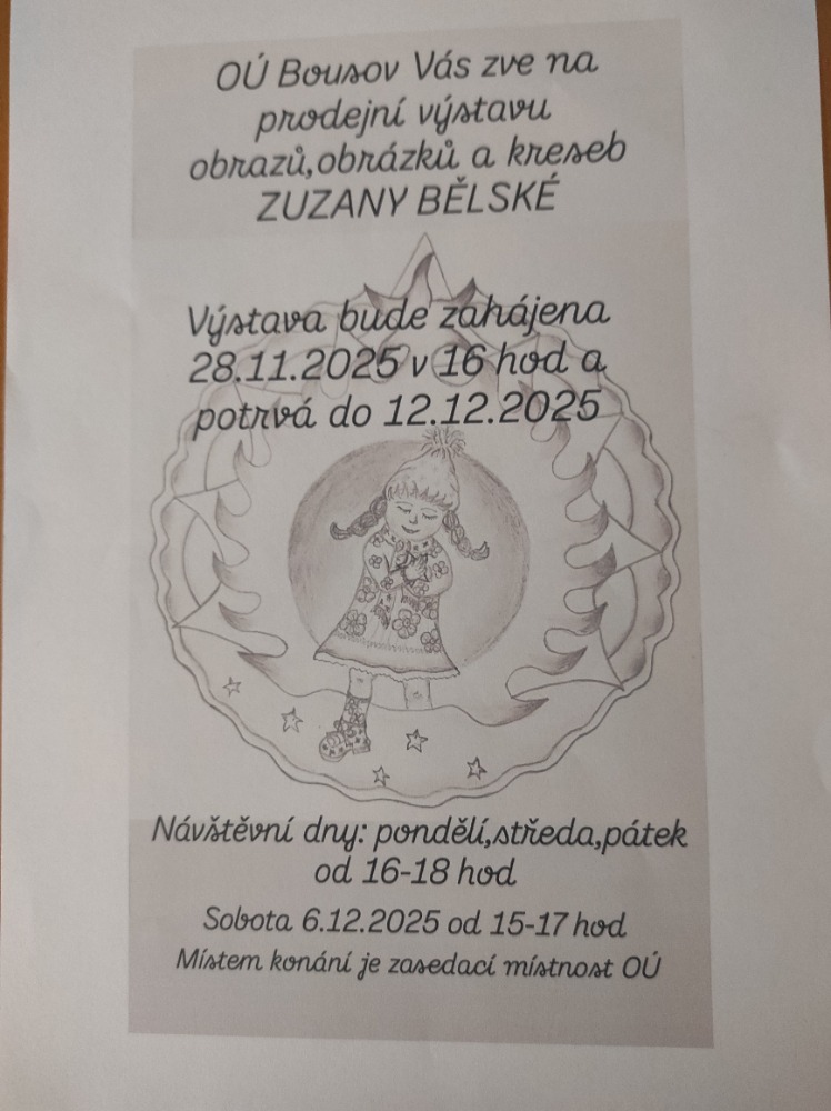 OÚ Bousov vás zve na výstavu obrazů, obrázků a kreseb Zuzany Bělské. Výstava bude zahájena v pátek 28. 11. v 16:00 hodin a potrvá do soboty 6. 12. (15:00-17:00 hodin). Návštěvní dny po, st, pá (16:00-18:00 hodin). Výstava se koná v zasedací místnosti OÚ Bousov.